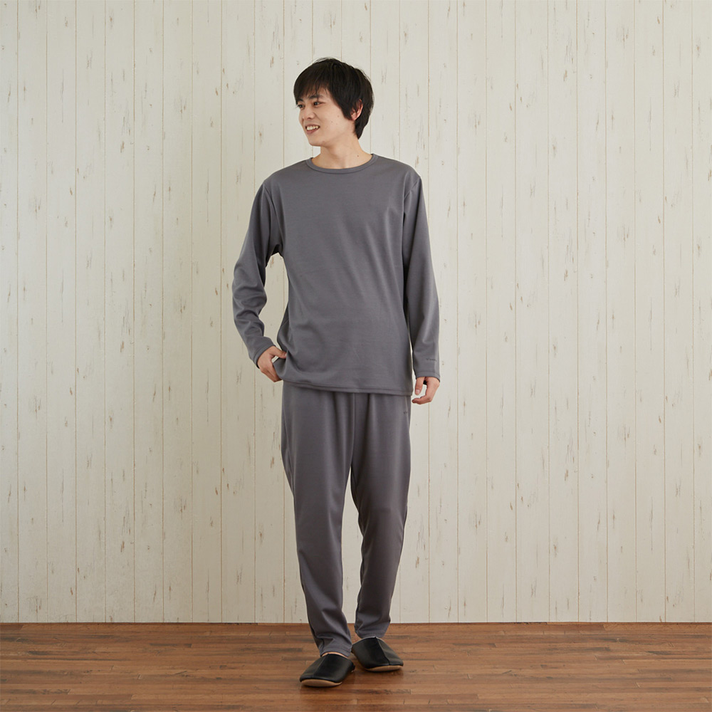 着心地は滑らかでしなやかな肌触り。軽量で伸縮性の効いたコットン混の生地なので家でのリラックスタイムに最適です。ハリ感があるため型崩れも少なく長く使用でき、シワになりにくく日々のお手入れも簡単です。お部屋での着心地の良さ、ノンストレスな着用感、リカバリーウェアとしての機能性を追求した結果、余計な仕様や飾りのないシンプルなデザインとなりました。さりげなく袖口と太ももに、フロッキー加工されたベネクスロゴの転写マークを配置。トップスのネック回りはスッキリとおさまる様型紙を調整し、ボトムスのウエスト部分は、当たりを軽減するため平ゴムのみの仕様で紐は不使用に。シンプルな分、ややゆとりを持った丈感や、ほど良いテーパードなどシルエットには細部までこだわったセットアップです。