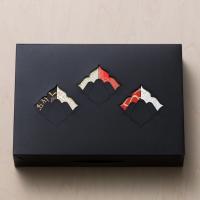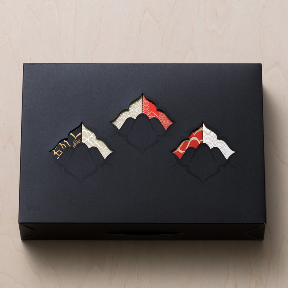 蒔絵調の美しい化粧缶に、赤坂柿山の二枚看板「慶長」と「慶凰」を詰め合わせました。柿のガクに山をあしらった「柿山紋様」を散りばめた、漆塗りの文箱のような艶やかな缶です。詰合せの小窓から除く華やかな美しいデザインが、改まった席での贈りものにもおすすめです。