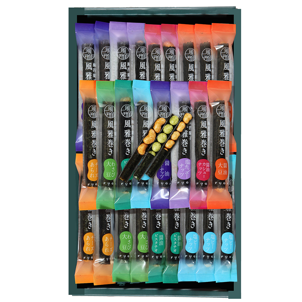 九州・有明海産の若摘み焼のりと、厳選した豆を使用した、人気の「風雅巻き」を8種類詰合せました。華やかなFAシリーズは、贈りものにぴったりのギフトセットです。家族の多いご家庭や職場などにおすすめです。