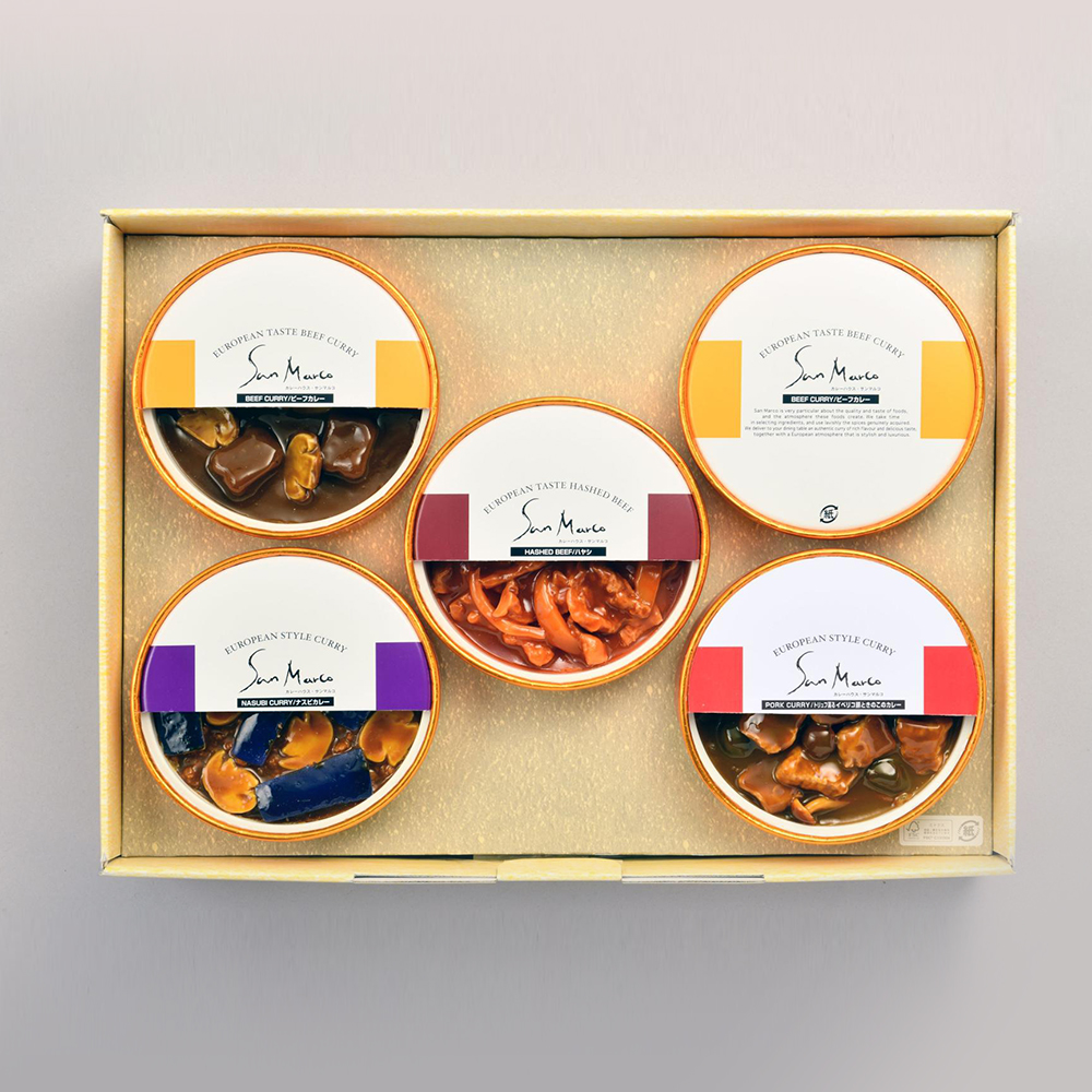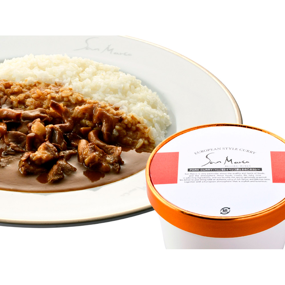 20数種のスパイスを独自のブレンドで配合した本格ビーフカレーソースをはじめ、イベリコ豚ときのこのカレーなどサンマルコの人気メニューを詰め合わせました。常温保管が可能な電子レンジ対応容器のため、ご家庭で手軽に調理していただけます。