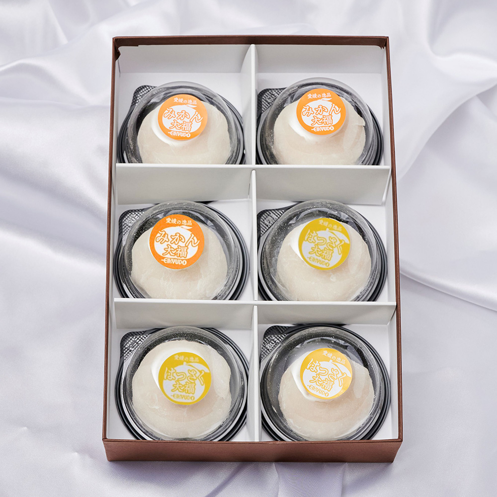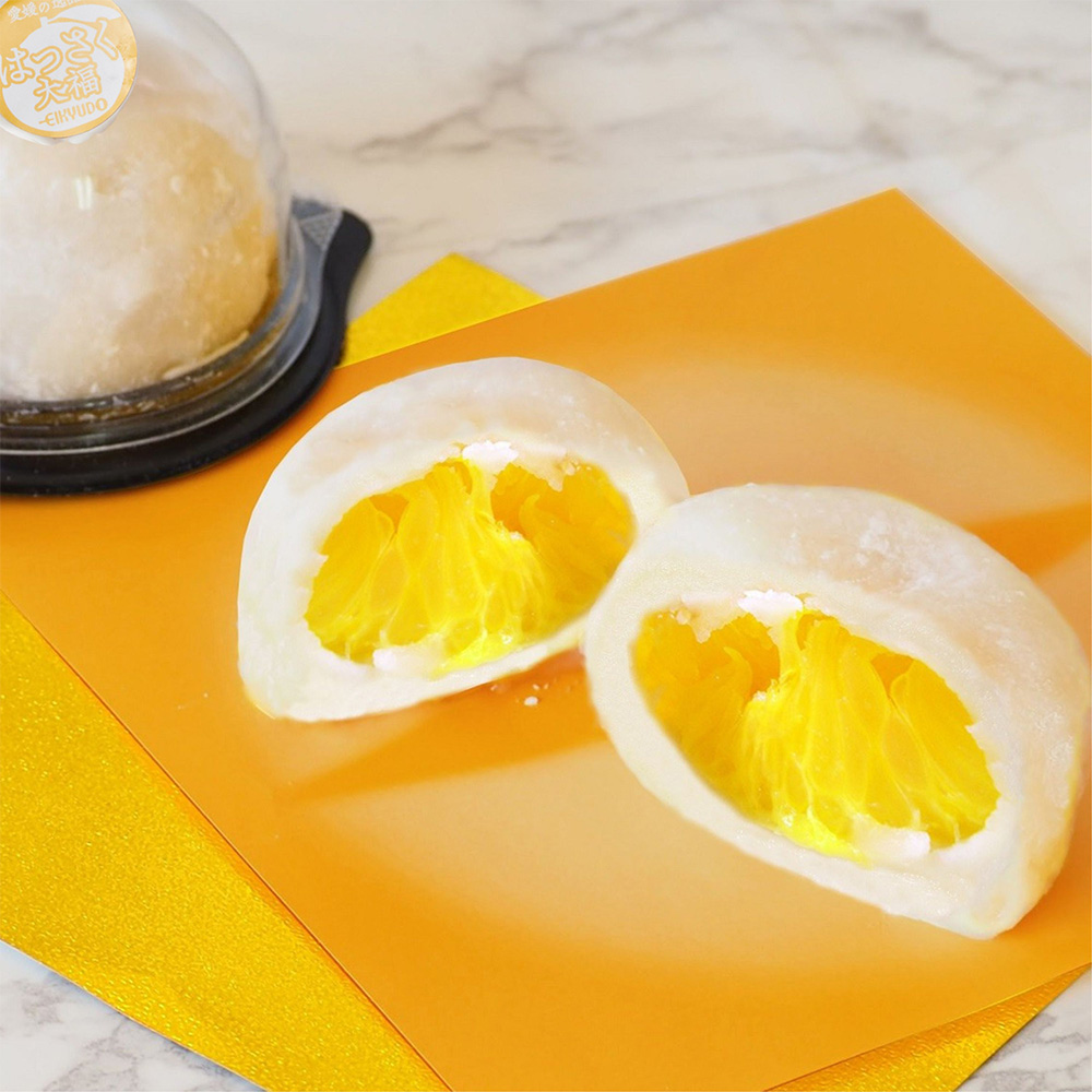 【冷凍便でお届けします。解凍まで時間がかかりますので、ご注意ください。】みかん(愛媛県産)、はっさく(愛媛県産)を自家製の白あんとお餅で包みました。フルーツ果汁のさわやかな酸味と甘みが口いっぱいに広がります。なめらかな白あんとマッチして絶妙な味わいです。職人が一つひとつ丁寧に仕上げています。
