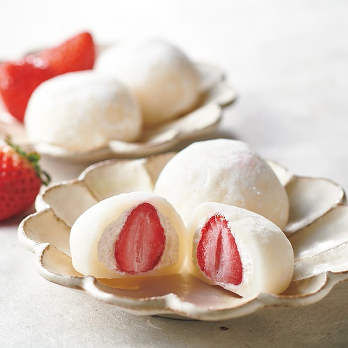 もち粉とうるち粉をブレンドした柔らかく伸びのある大福で、ホイップクリームと福岡県産あまおうを1粒包み込みました。やわらかいお餅の食感といちごの酸味、優しい甘さのクリームが1つになった味わいのバランスをお楽しみください。