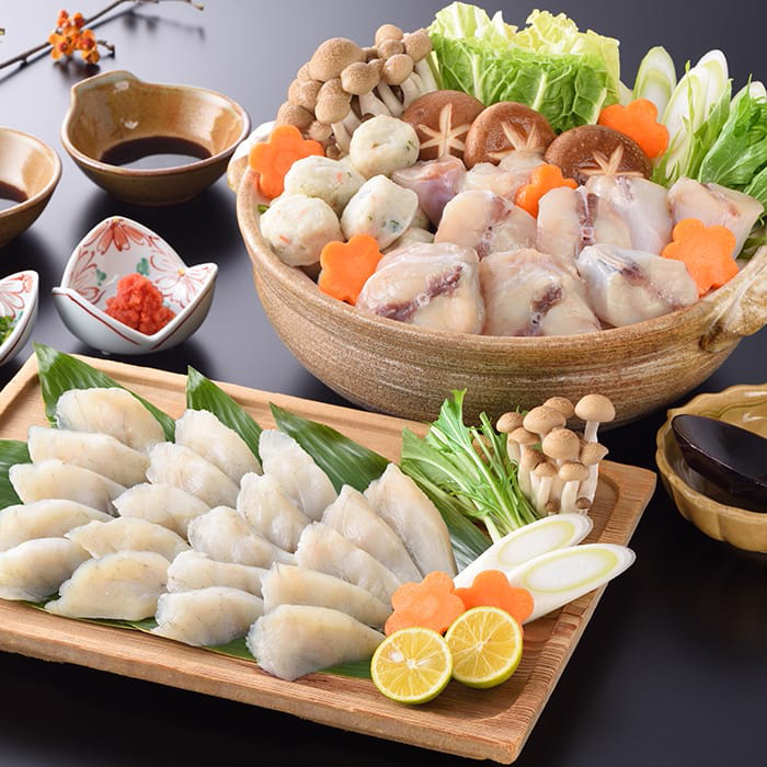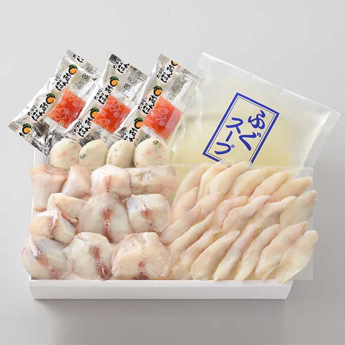 真ふく切り身300g、真ふくスライス100g、ふく入りつみれ×4個、ふぐスープ500g×1、ぽん酢30ml×3、もみじおろし5g×3