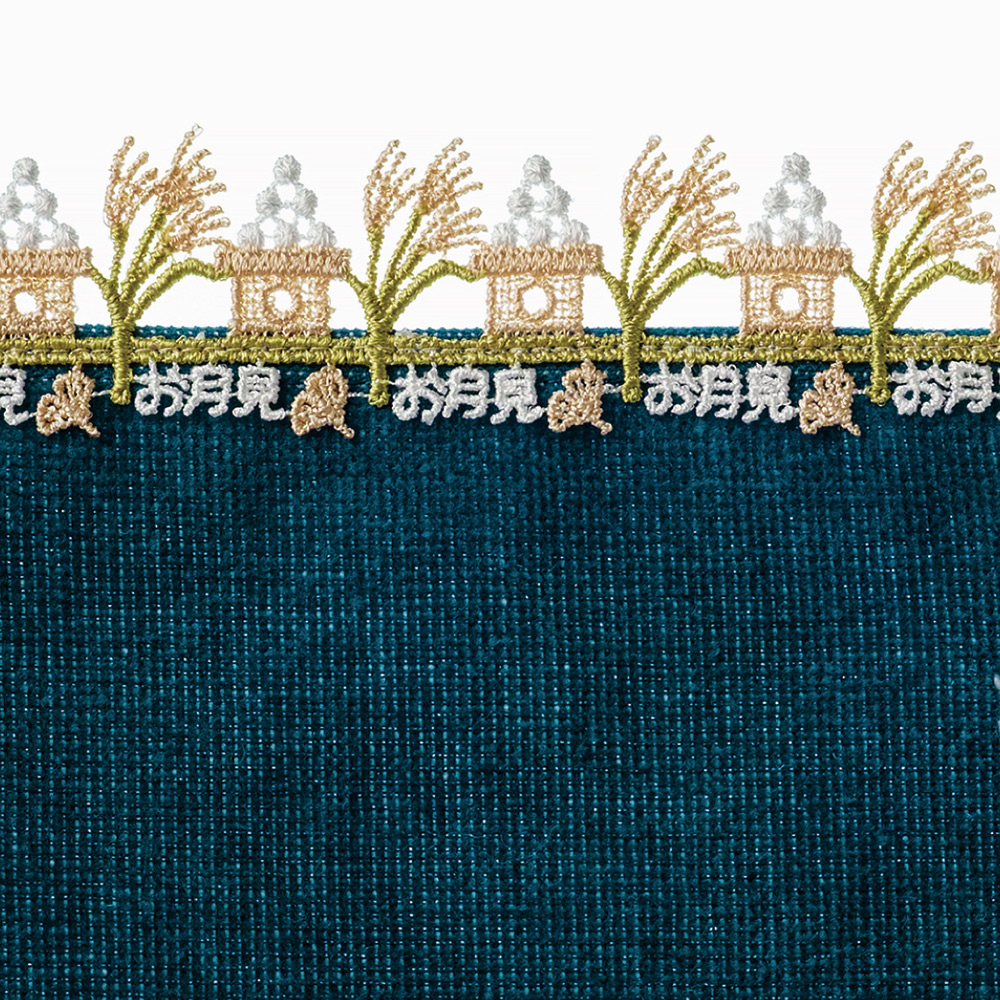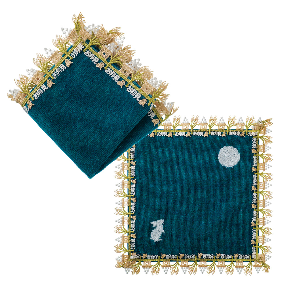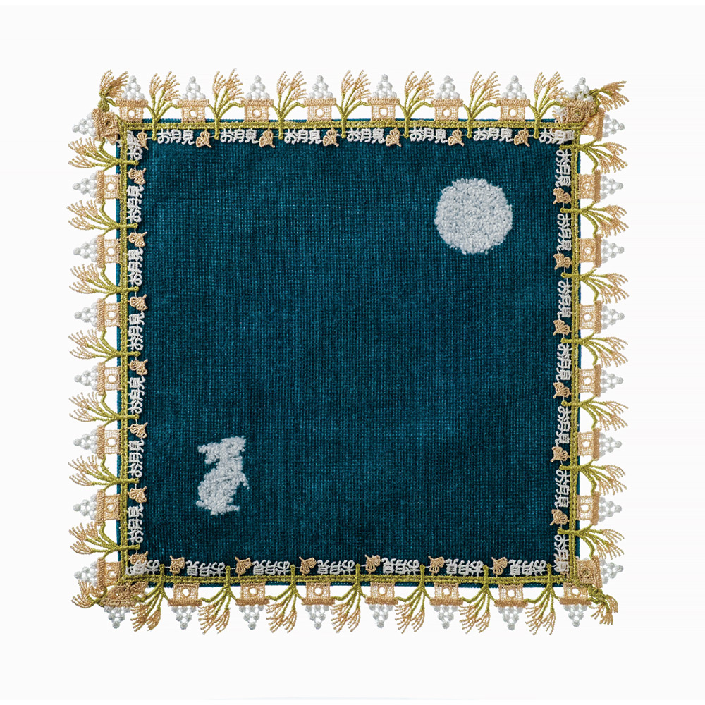 <お月見うさぎ>秋になると空気がすんで月がとても綺麗に見えます。平安時代に中国より伝わったとされる「お月見」の文化。五穀豊穣への感謝や翌年の豊作を願う伝統行事です。お団子、ススキ、イチョウ、「お月見」の文字をレースで繊細に表現しました。ハンカチ生地は、月を見つめるうさぎを配してノスタルジックなハンカチに仕上げました。