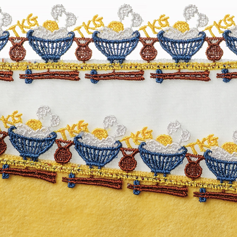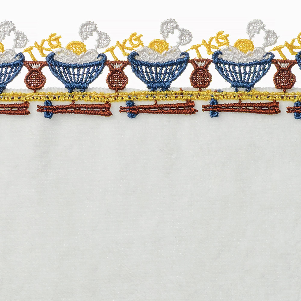 <卵かけご飯>日本の食文化を代表する卵かけご飯(TKG)が登場。温かいご飯に新鮮でうま味が凝縮された味わい深~い卵がのり、趣のあるお椀やお箸を多色の糸で繊細に表現しました。生地色は、卵黄色のイエローと白米のホワイト。こだわりの詰まった逸品です。ぜひ、ご賞味ください。