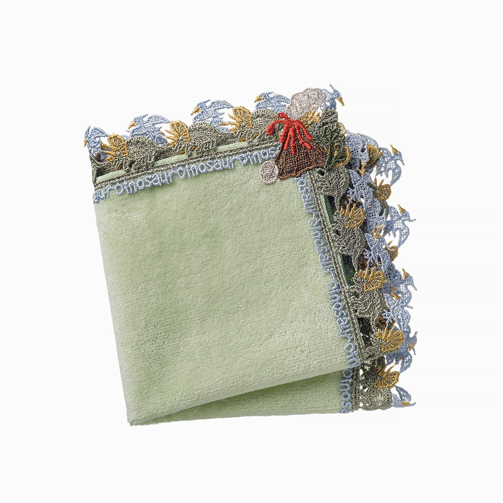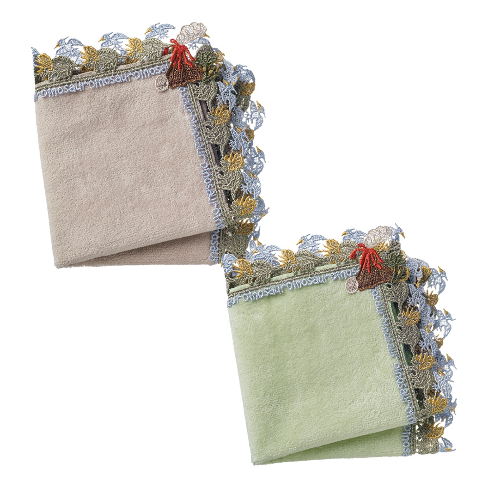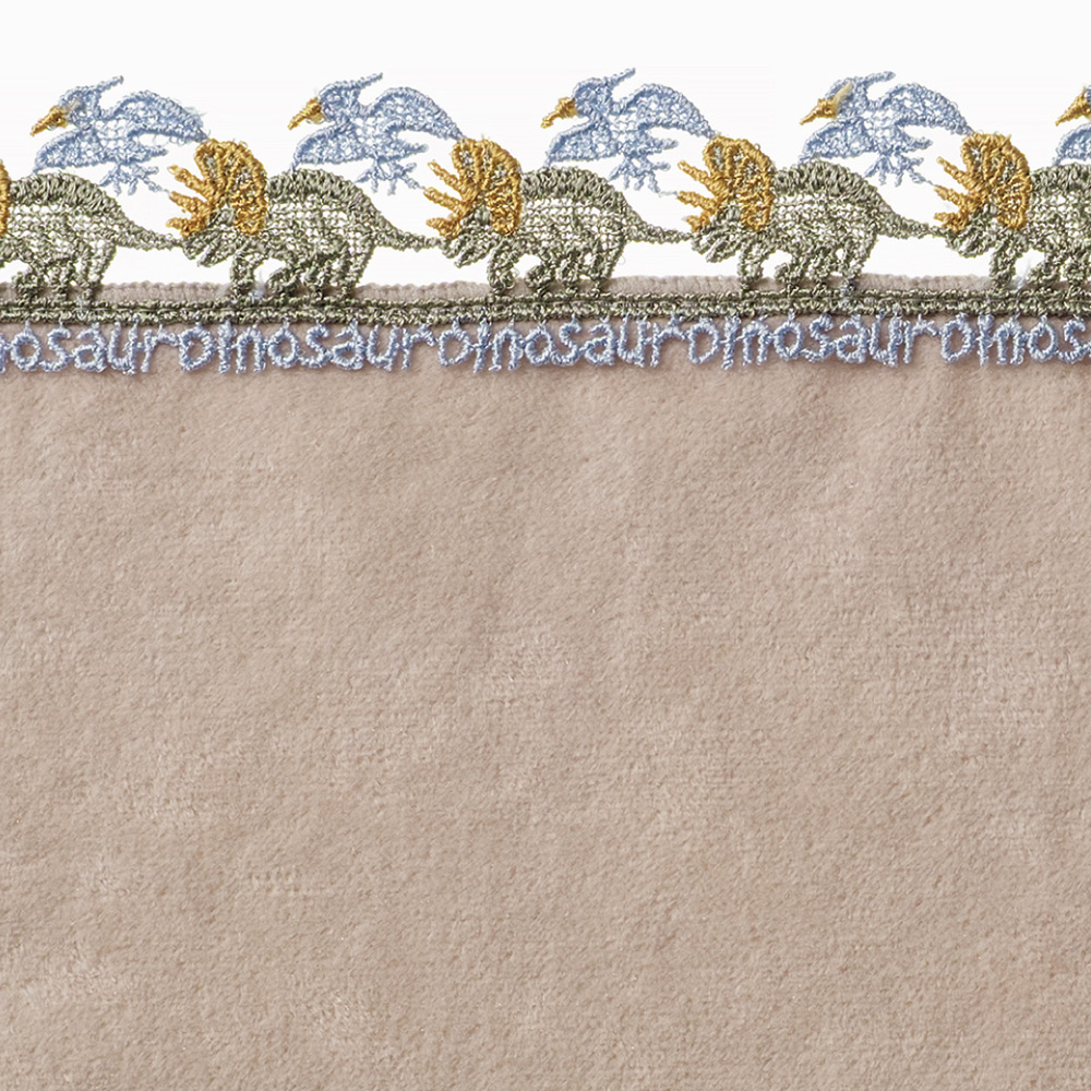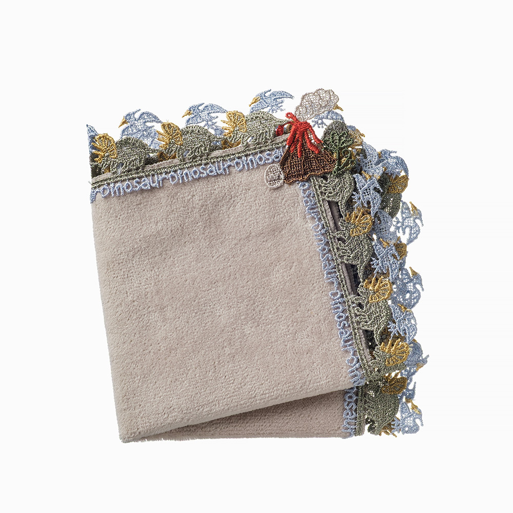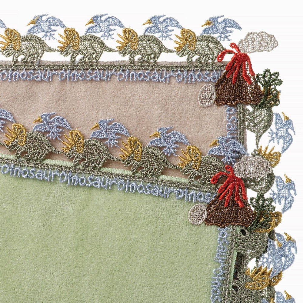 <恐竜>7000万~6600万年前(白亜紀後期)に存在していたとされる、えり飾りの大きいトリケラトプスと翼開長9mほどのプテラノドンを可愛くレースにしてみました。モチーフレースで、噴火山や植物、恐竜の卵を表現。恐竜の世界へタイムスリップ。