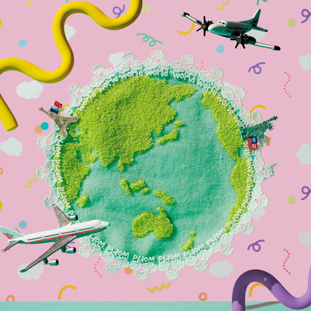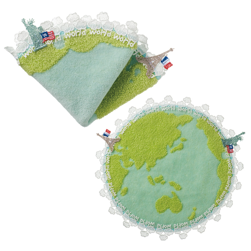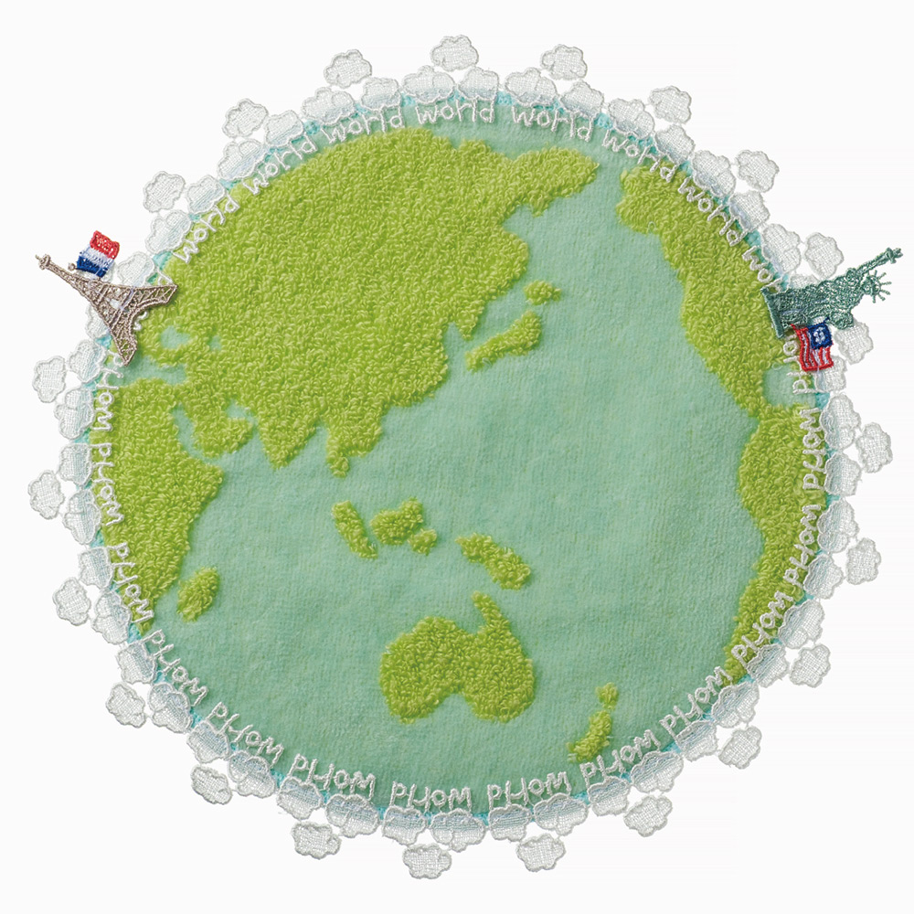 <世界旅行>旅に出よう。アメリカはニューヨーク、フランスは花の都パリへ。まるい生地を地球に見立て、「world」の文字を施した白い雲レース。自由の女神とエッフェル塔のモチーフレースをつけました。旅心を誘うレースハンカチで、小さな世界旅行をしませんか。
