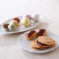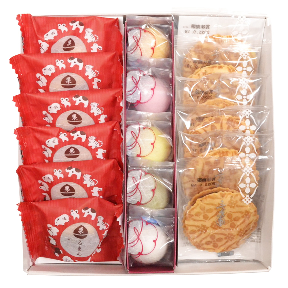 横浜市本牧の庭園「三渓園」とのコラボレーション商品の求肥餅と、粒あんをはさんだ創作菓子「三渓園花文合わせ」、季節限定・栗饅頭の「栗ろまん」、ひと口サイズの人気のもなか菓子「花元町」の詰め合わせです。