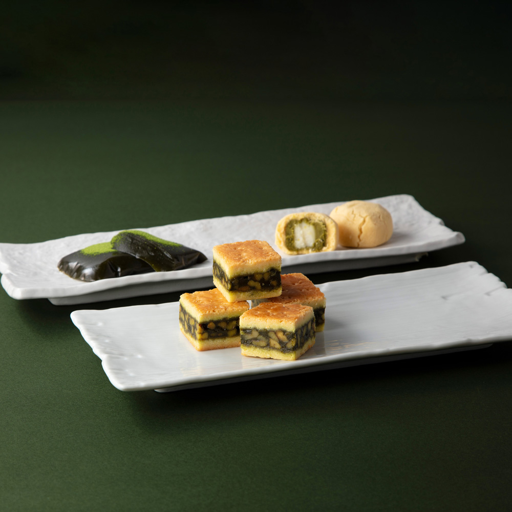 宇治抹茶を練り込んだキャラメルにくるみをぎっしりと入れた焼き菓子と、宇治抹茶の風味や色合いをいかしたわらび餅。宇治抹茶餡とクリームチーズ餡を包んだしぐれ菓子。3種類の抹茶のお菓子詰合せです。