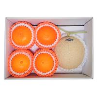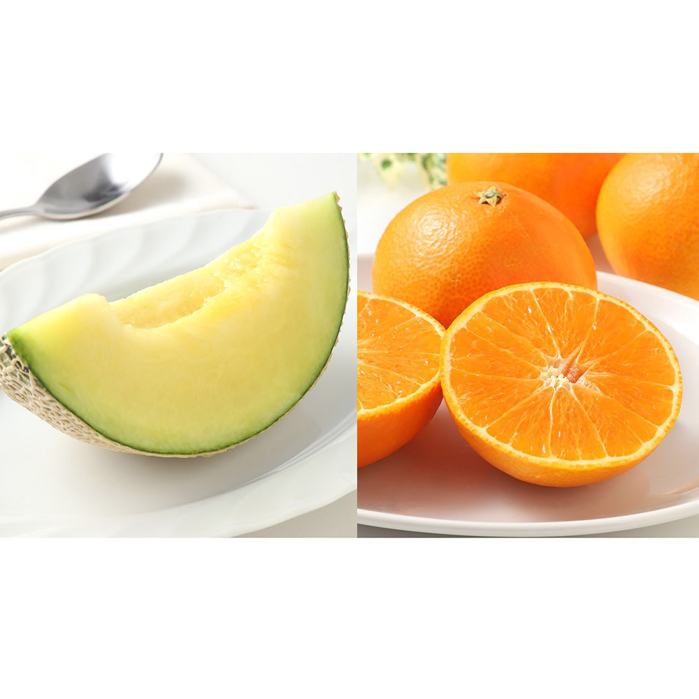 1本の木に1個の実だけ残し栄養を集中させて栽培したマスクメロンと、愛媛県オリジナル品種のゼリーのような食感のオレンジ「紅まどんな」の詰合せです。