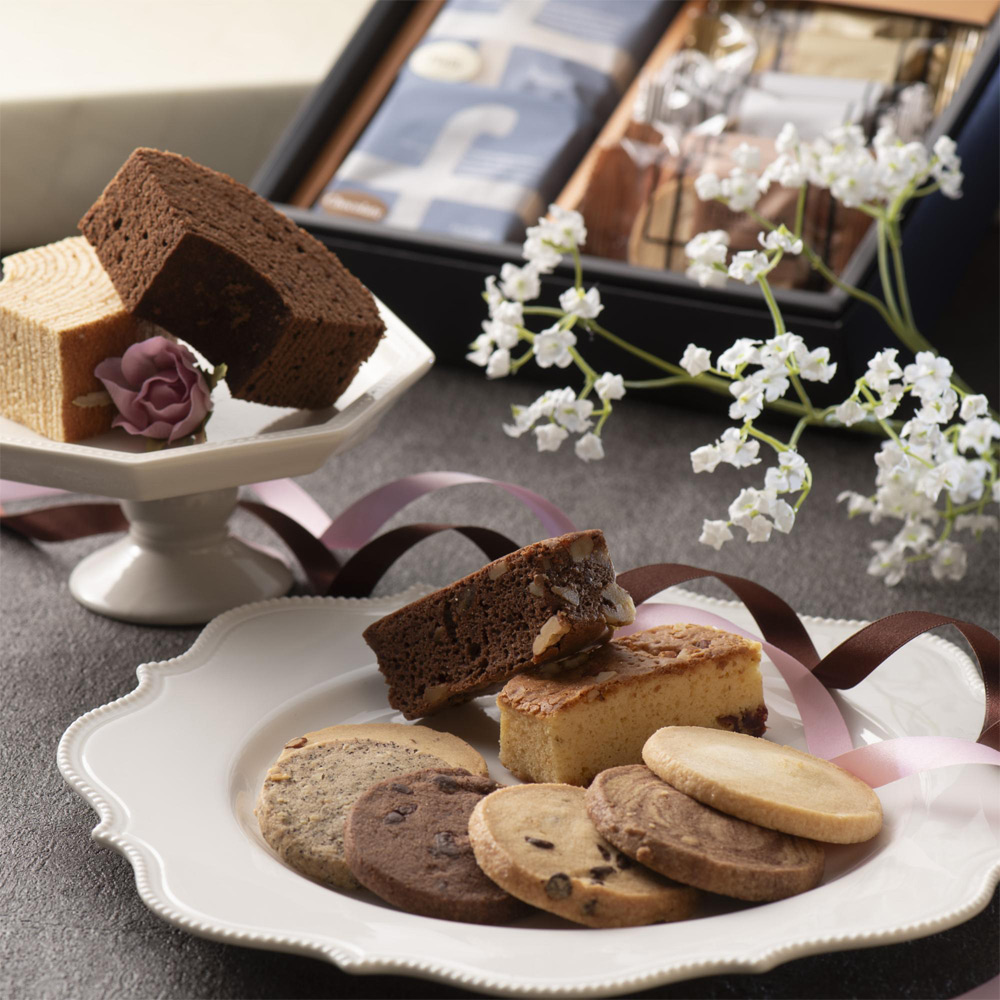 ほんのりオレンジが香るしっとり食感のチョコブラウニー、ドライフルーツがたっぷり詰まったブロンディと、プレーンとチョコどちらも味わえるソフトバウムクーヘンのセットです。