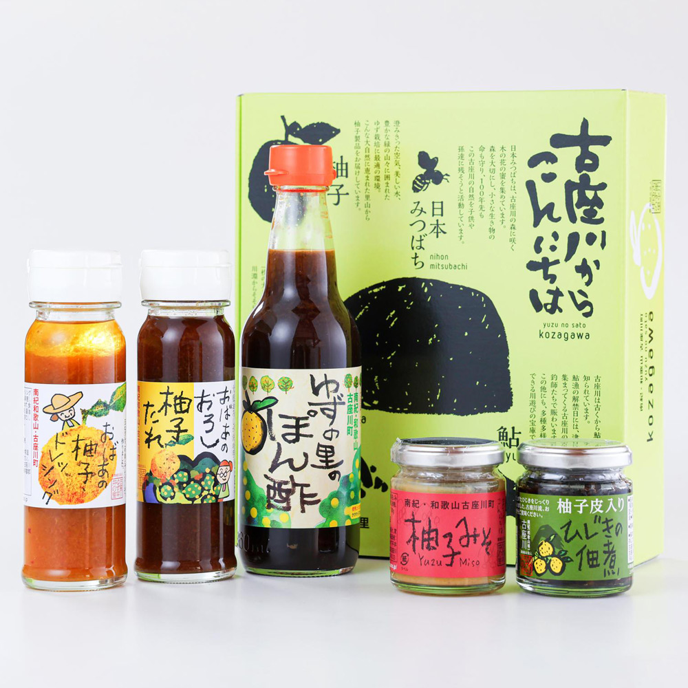 ゆずドレッシング180ml・おろし柚子たれ180ml・ゆずの里のぽん酢360ml・柚子みそ100g・ひじきの佃煮100g 各1個