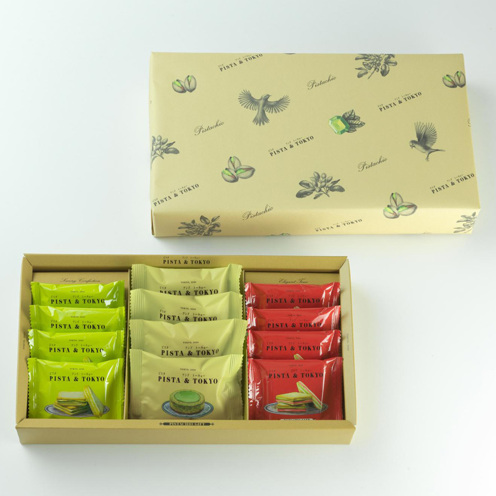一番人気の5層のピスタチオサンド2種と、ピスタチオケイク生地にピスタチオチョコレートを流し入れた「ピステーヌ」を詰め合わせました。冬季限定です。