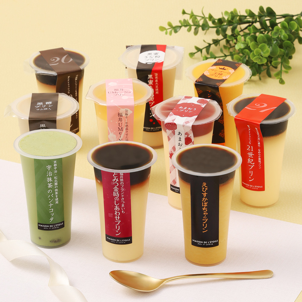 20世紀プリン・21世紀プリン・あまおうプリン・えびすかぼちゃのプリン・黒蜜きな粉プリン・宇治抹茶のパンナコッタ・福井UMe-Naプリン・黒糖プリン(ラム酒入)・マンゴーの王様プリン・とみつ金時のしあわせプリン 各120ml×1 計10個