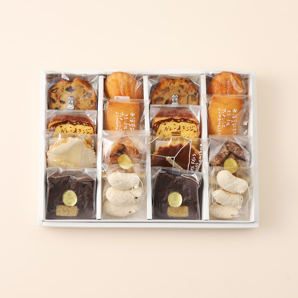 パウンドケーキ×2個、ガトーオランジュ×2個、マドレーヌ×2個、フィナンシェ×2個、ディアマンクッキー(プレーン・ショコラ)各1個、ジンジャークッキー(レモン・ショコラ)各1個、ガトーショコラマロン×2個、とりのメレンゲ(ココナッツ)×2個 計16個
