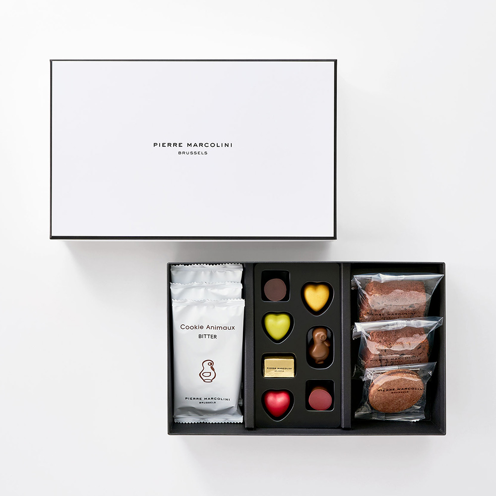ピエール マルコリーニのこだわりのショコラと、オリジナルクーベルチュールを使用して作られた焼き菓子を両方お楽しみいただける贅沢な詰め合わせ。