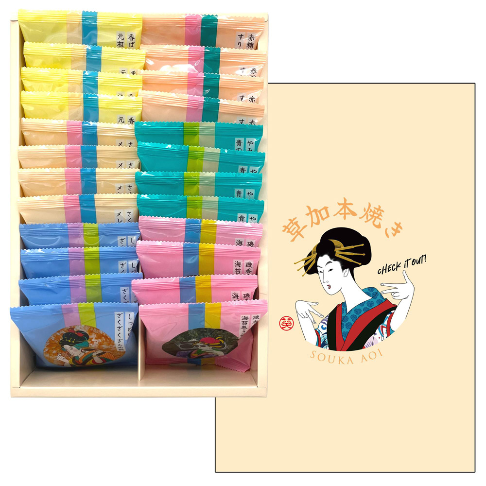 江戸時代と現代日本のカルチャーを融合したキャラクターをパッケージにあしらった、誰にでも親しみやすいお煎餅です。ベーシックな醤油をはじめ、鼻に抜けるさわやかな辛みが特徴のやみつきわさび煎やコクと甘さのざらめ煎等6種類のバラエティに富んだ詰合せです。