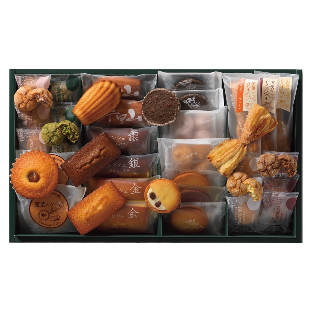 フィナンシェ金・フィナンシェ銀(焦がしバター)・千里山マドレーヌ・蜜栗のケーキ各2、チョコチップクッキー×2、天使のリボンパイ3種、クリームサンドラング2種計3、ココナッツミルク4個入、マカロンベリー4個入、ポルポローネ4種各3