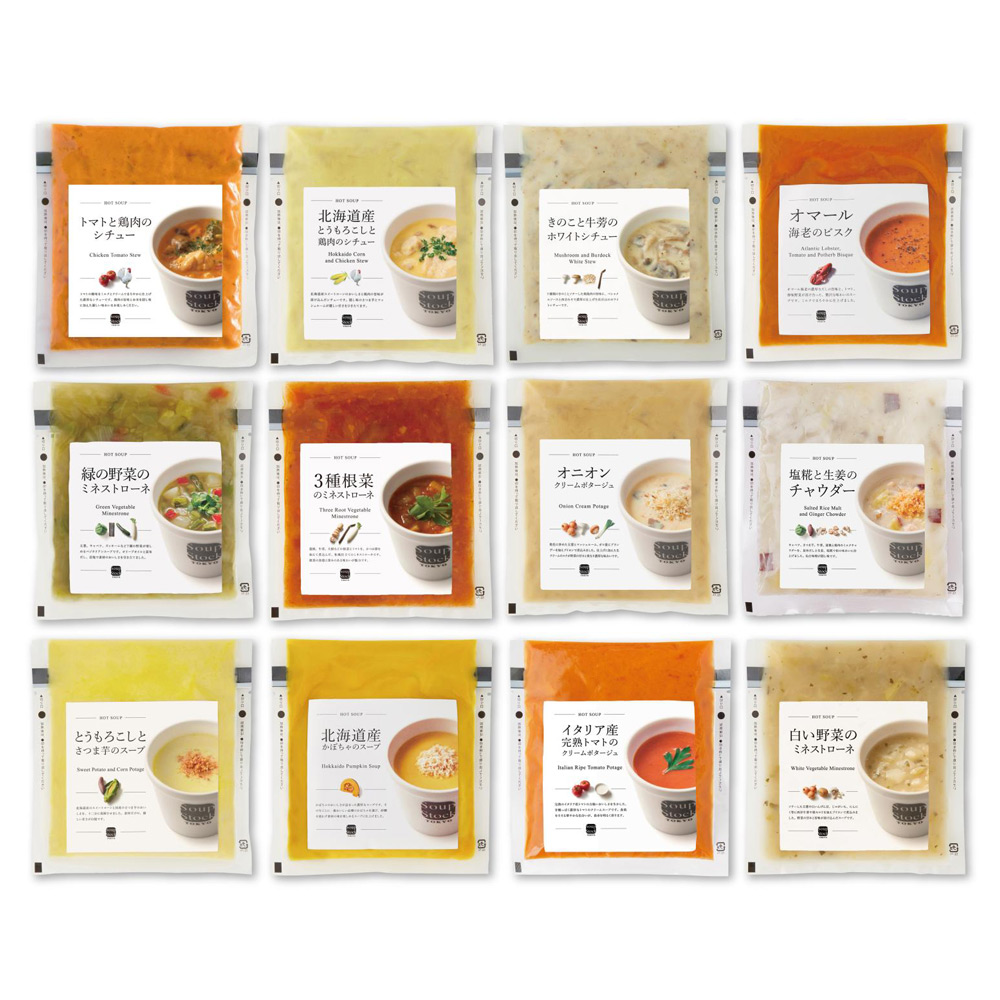 季節限定の「トマトと鶏肉のシチュー」や、「北海道産とうもろこしと鶏肉のシチュー」など食べ応えのあるシチューと7種の野菜が楽しめる「緑の野菜のミネストローネ」、スープストックトーキョー1番人気の「オマール海老のビスク」など12種類のスープをお楽しみいただけるセットです。電子レンジで簡単にお召し上がりいただけます。