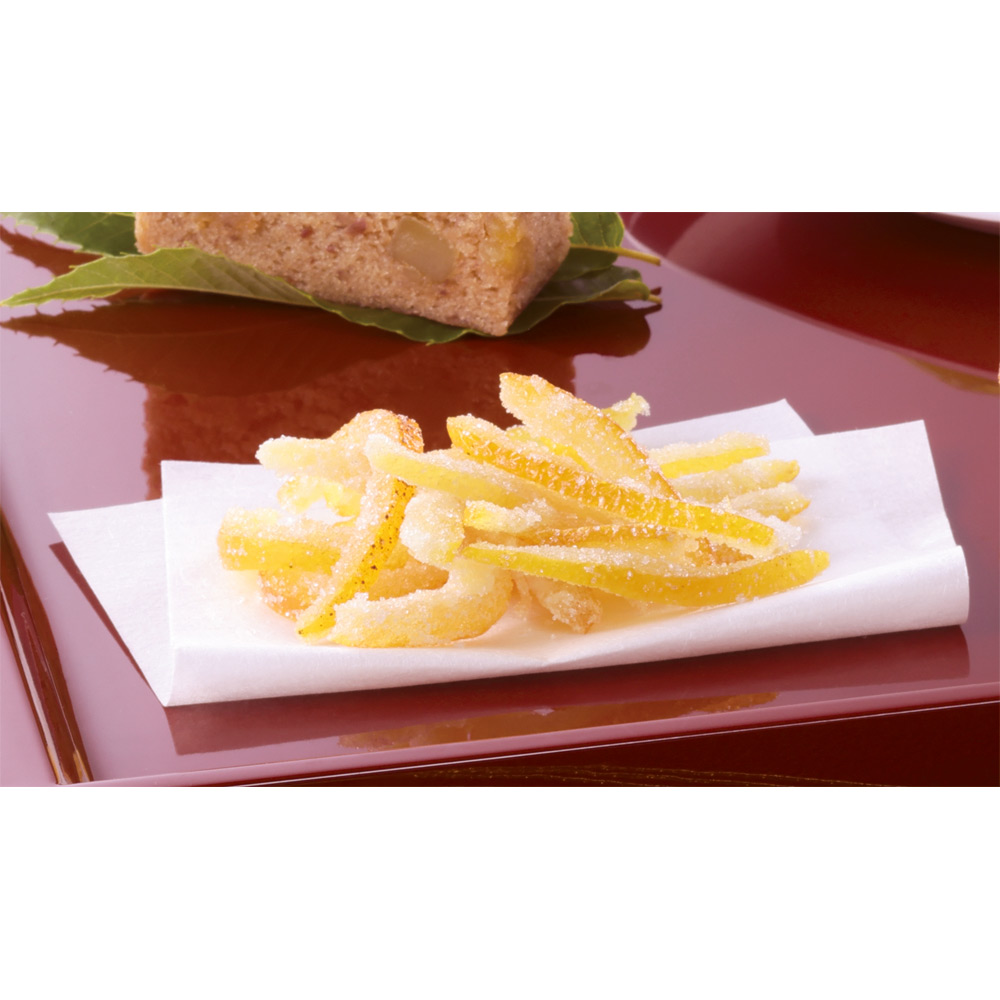 しっとり蒸しあげた、きざみ栗入りの「栗カステラ」。天面に白桃の果肉をあしらった「白桃フィナンシェ」。白く淡い道明寺羹に、かのこ豆をしずめた「白雪の舞」。白桃、りんご、いちご、ブルーベリーの4種果実を使用した「果実ようかん」。しっとりと蜜を含ませた、ほろ苦い柚子皮「とこよ」。味わい豊かに、季節の果実菓子を詰め合わせました。