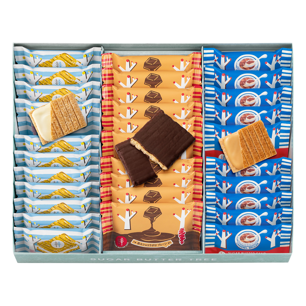 シリーズ一番人気の「シュガーバターサンドの木」に、季節限定の「キャラメルブリュレ」と「炭火ショコラがけ プレーン」が入った華やかなひと箱。季節限定の味わいと定番を食べ比べてみたい方におすすめのコレクションです。