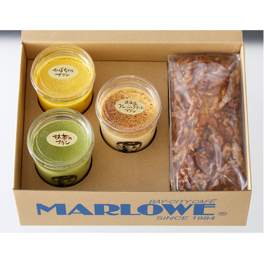 マーロウ一番人気の北海道フレッシュクリームプリンと、かぼちゃが苦手なお子様にもおススメできるかぼちゃのプリン、抹茶の香りがしっかりと感じられる抹茶プリンの3種のプリンと、くるみの香ばしさとアマレットの豊かな甘い香りが魅力のくるみのパウンドケーキをギフトセットにいたしました。