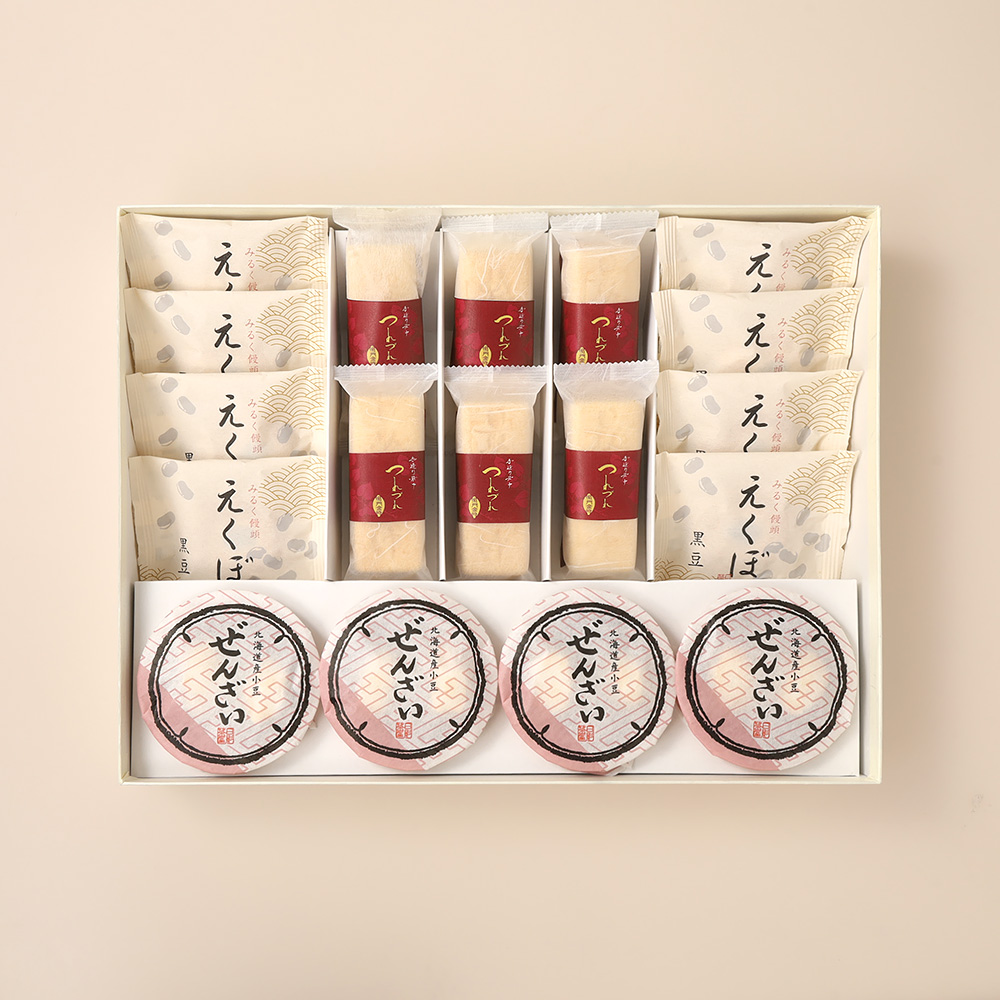 詰合せに入っている「みるく饅頭えくぼ」は、ミルク餡をしっとりした生地で包み込んで北海道産の黒豆を添えました。「手造り最中つれづれ」は鳴門金時の芋餡と風味豊かな最中種を手作りで合わせるサクサク食感の最中です。北海道産小豆でつくった「ぜんざい」も入った特別な方へのギフトにおすすめです。