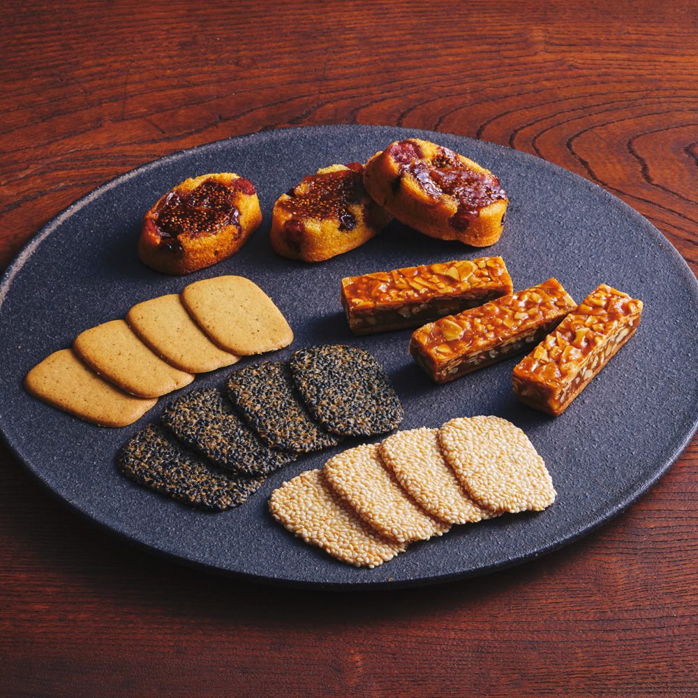 香ばしいごまやうま味素材を薄く焼き上げた薄玻璃チュイル、くるみとキャラメルの琥珀ヌガーバー、果実のうま味を閉じ込めた贅沢フルーツケーク。素材の力と職人の技が響き合う、個性豊かな焼き菓子の詰め合わせです。贈りものだけでなく、ご自宅用にもおすすめです。