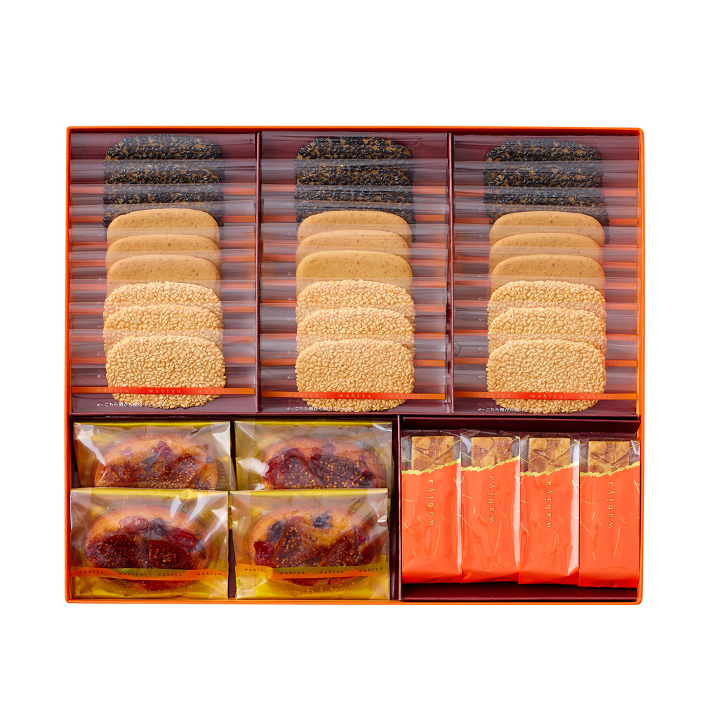 35個(贅沢フルーツケーク×4個、薄玻璃チュイル(黒ごま×9枚、白ごま×9枚、うま味×9枚)、琥珀ヌガーバー×4個)