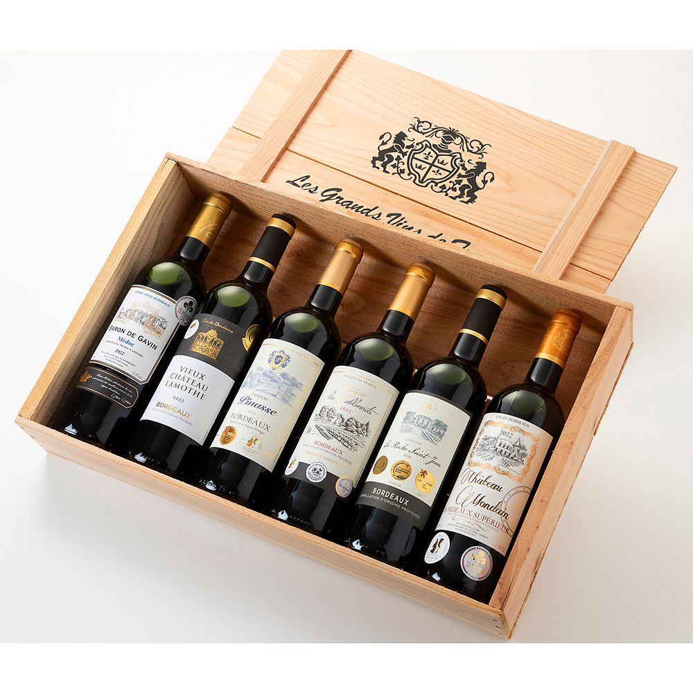 バロン ド ギャバン2022(70ミリオンズデギュスタトゥール2024年金賞)、ヴュー シャトー ラモット2023(【2冠】パリ農産物コンクール2024年金賞、ジルベール&ガイヤール2024年金賞)、シャトー ピナス2022(【2冠】リヨン国際コンクール2023年金賞、フェミナリーズコンクール2024年金賞)、シャトー レ サブロネ2022(【2冠】フェミナリーズコンクール2023年金賞、テール・ド・ヴァン・コンクール2023年金賞)、シャトー ラ ロシュ サン ジャン2023(【3冠】マコンコンクール2024年金賞、ボルドーコンクール2024年金賞、リヨン国際コンクール2024年金賞)、シャトー モンディーン2022(【2冠】フェミナリーズコンクール2023年金賞、70ミリオンズデギュスタトゥール2024年金賞)すべて赤・ミディアムボディ/フランス 各750ml 計6本