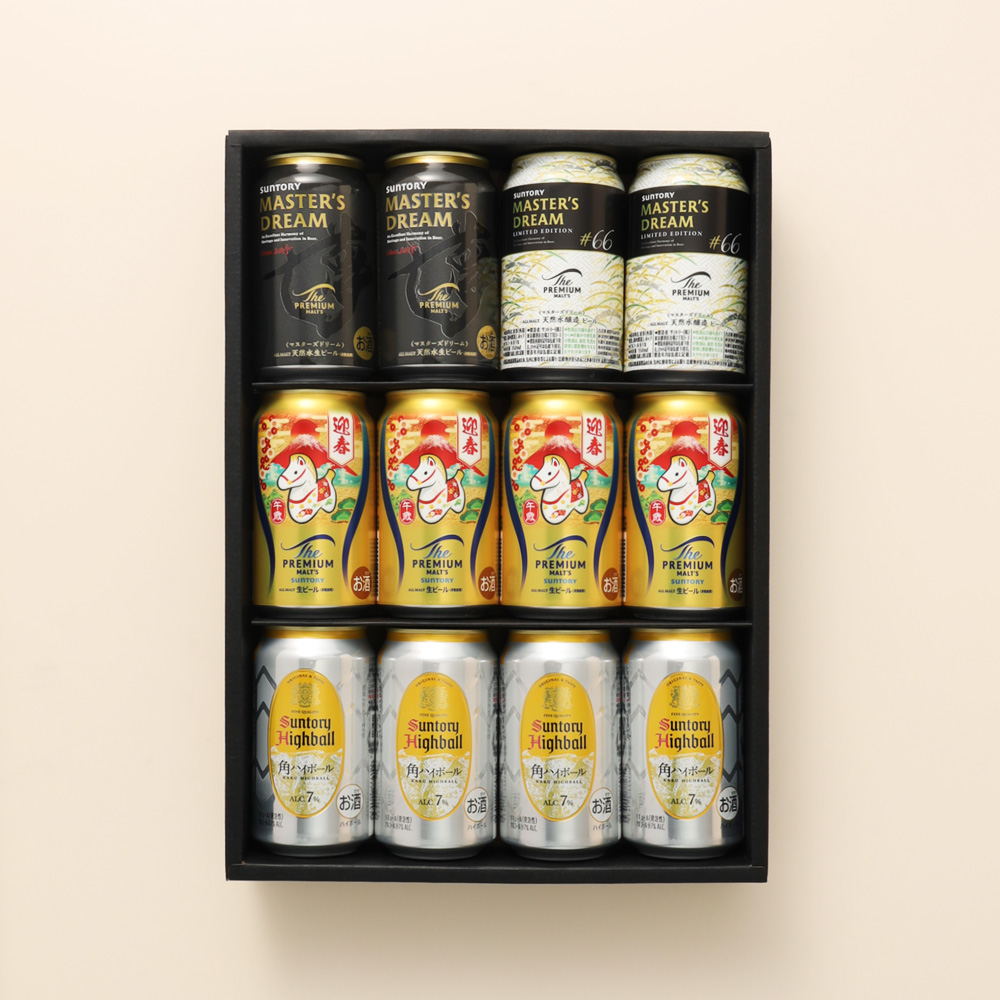 素材や製法にとことんこだわり、ただうまさだけを追い求めた醸造家の夢のビール、「マスターズドリーム」を2種類。来年の干支である「午(うま)」のデザインをあしらったプレモル。加えて、人気の角ハイボールも入ったバラエティ溢れるセットです。