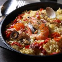 アサリやエビ、ムール貝、イカなどの海鮮と白身魚のアラをメインに香味野菜を加えてじっくり煮込んだ魚のだし(フュメ・ド・ポワソン)で仕上げたパエリアです。電子レンジで温めるだけで手軽に本格パエリアをお召しあがりいただけます。