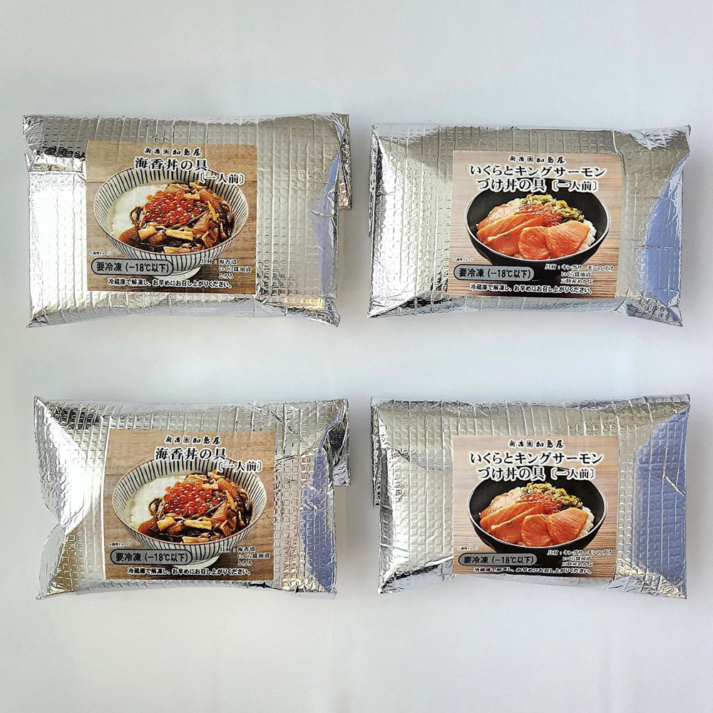 海香丼の具130g×2(海香丼の具:するめいか、いくらしょう油漬、ボイル帆立貝柱、数の子、添付とろろ:長芋(やまいも含む))、いくらとキングサーモンの具90g×2(いくらとキングサーモンづけの具:キングサーモン、めかぶ、いくらしょう油漬)
