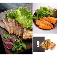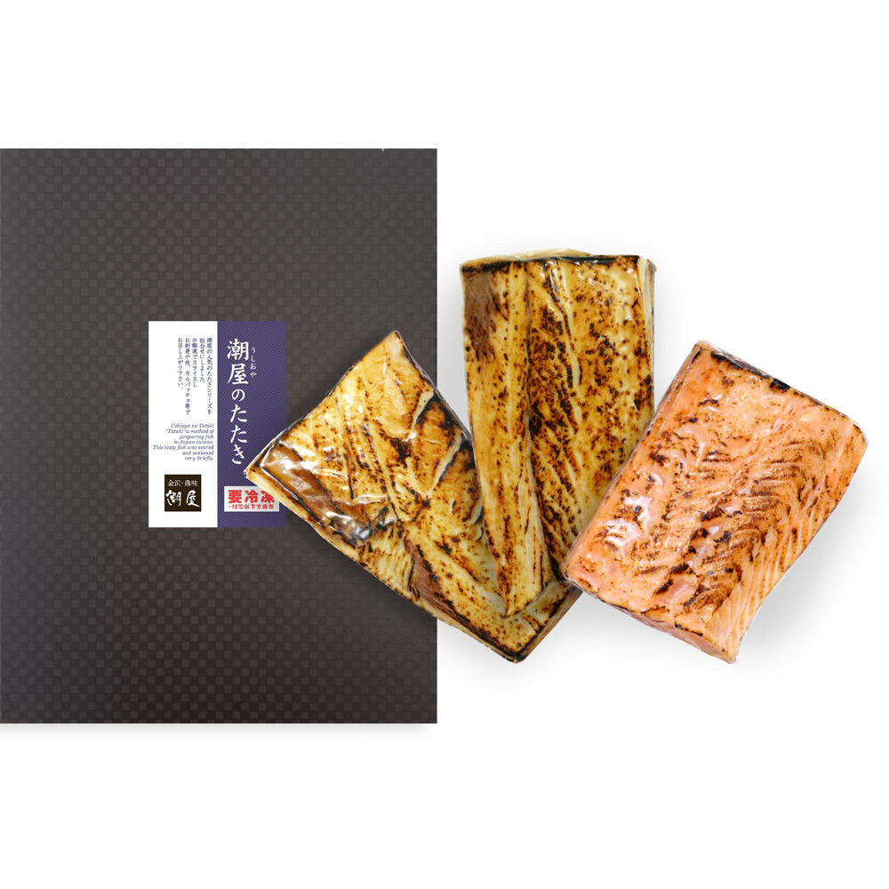 人気の鰤とサーモン2種のたたきをセットしました。金沢・逸味潮屋ならではの贈りものです。