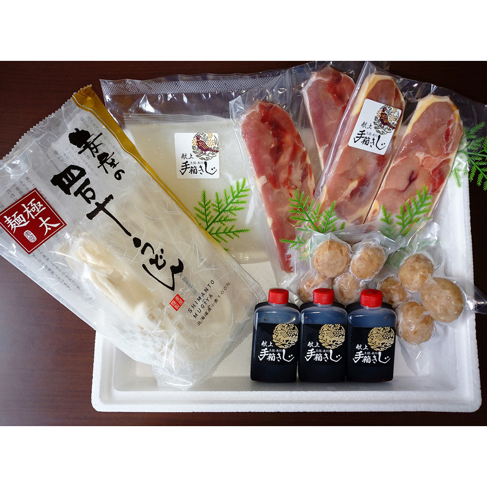 きじスライス肉240g(120g×2)、きじガラスープ200ml、きじ肉入り鶏団子20g×8、うどん200g×2、特製すき焼きだれ80g×3