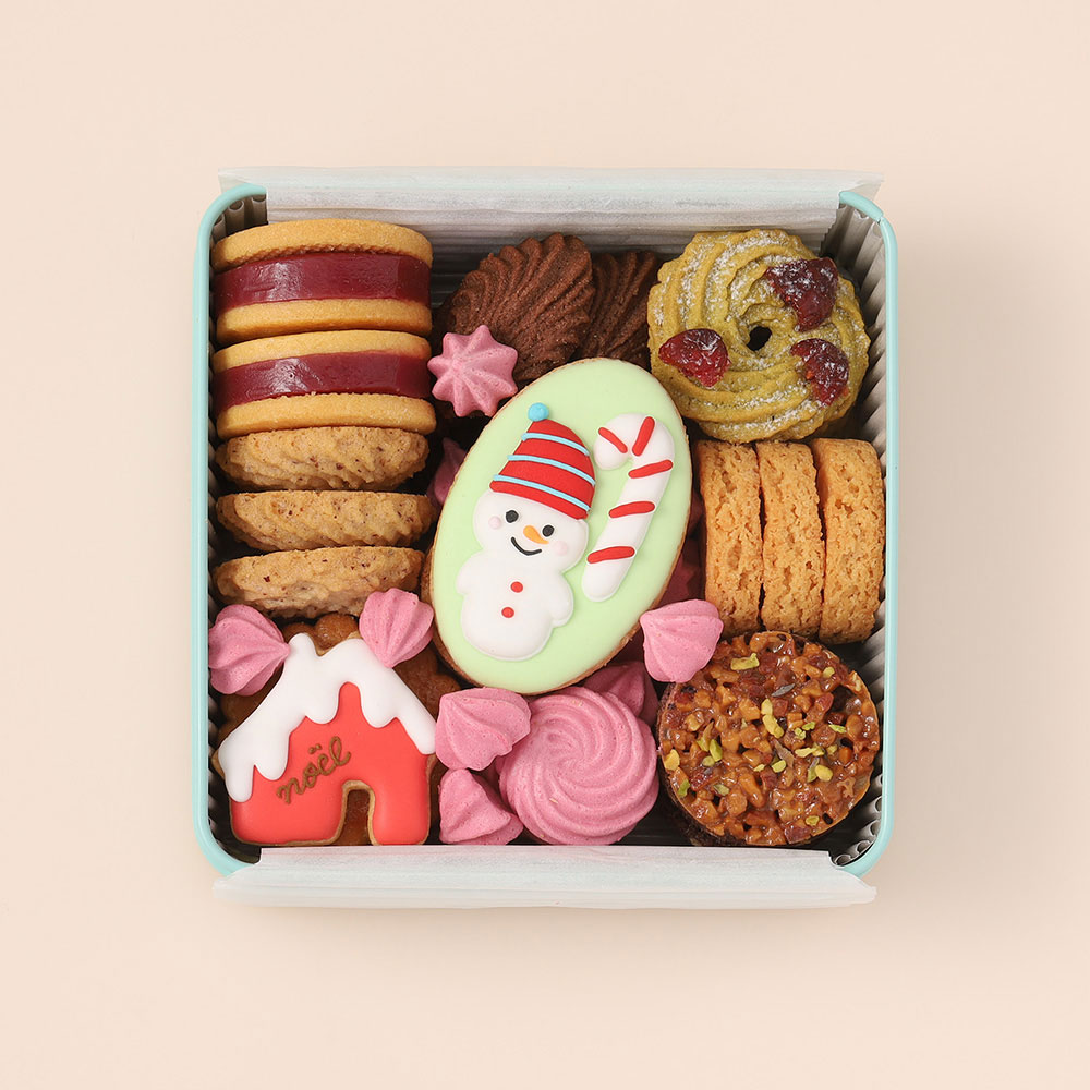季節限定の味を組み合わせたクッキー缶です。ラズベリー味のサンドクッキーやラズベリーのメレンゲ。ピスタチオリースクッキーにナッツをキャラメリゼして重ねたフロランタンなど、ゲランドの塩と国産バターを使ったバターの香り豊かなクッキーです。スノーマン・スノーハウスのアイシングクッキーも入ったクリスマス限定クッキー缶です。