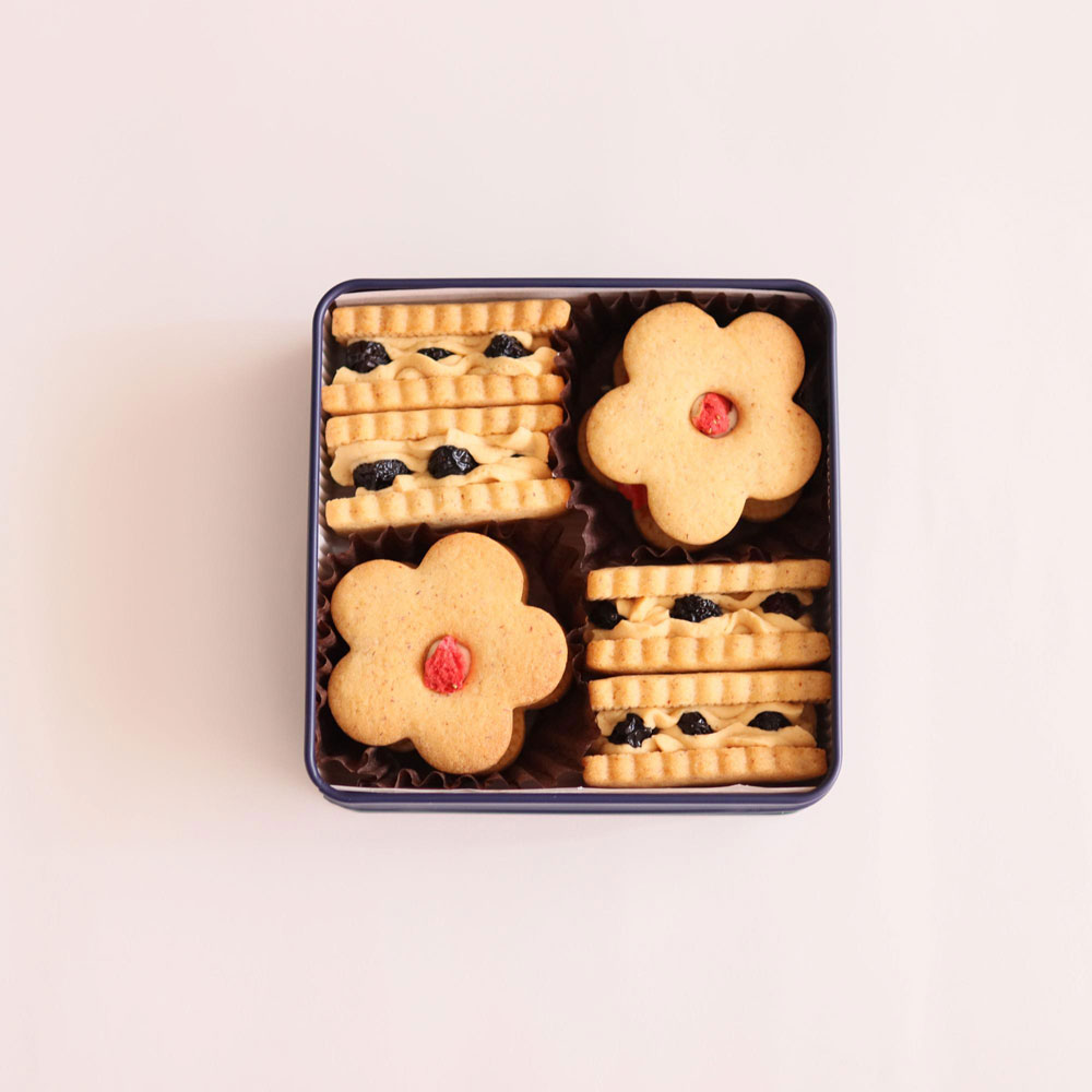 【冷凍便でお届けします。解凍まで時間がかかりますのでご注意ください。】バター、小麦粉、和三盆糖を使用したサクサクと香ばしいクッキーは1枚ずつ型抜きして焼き上げております。バタークリームと甘酸っぱいイチゴ、ラム酒漬けの大粒で希少な「プレミアムサヤキレーズン」をサンドしています。<バニラバタークリームといちご>ミルク感あふれるバタークリームにフリーズドライのイチゴを合わせました。フルーティーな香り、甘酸っぱい酸味が調和した誰にでも愛される味わいに仕上がりました。<塩キャラメルバタークリームとプレミアムサヤキラムレーズン>北海道産生クリームとバターを焦がして作る手作り塩キャラメルをバタークリームに合わせ、香ばしさをプラスし、濃厚で香り豊かなラム酒に漬け込んだサヤキレーズンをサンドしました。キャラメルとレーズンの相性は抜群です。プレミアムサヤキレーズン:3カ月間程日陰で乾燥させることでギュッと甘みを詰め込んだレーズンです。ぶどう本来の美味しさが皮の中に閉じ込められ、ドライフルーツとは思えないほどの濃厚な味わいと上品な甘みを感じていただけます。