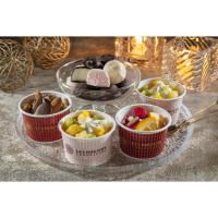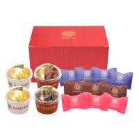 口どけのよいクリームをバニラとチョコ2種類のアイスの上に絞り、素材感あふれるフルーツとミックスナッツを贅沢にトッピングしたアイスと、バニラ・クランチ・ストロベリーの3種類が楽しめる、一口サイズのアイスとのセットです。フランス国家最優秀職人章「M.O.F」受章の女性天才シェフ、アンドレ・ロジェ監修。