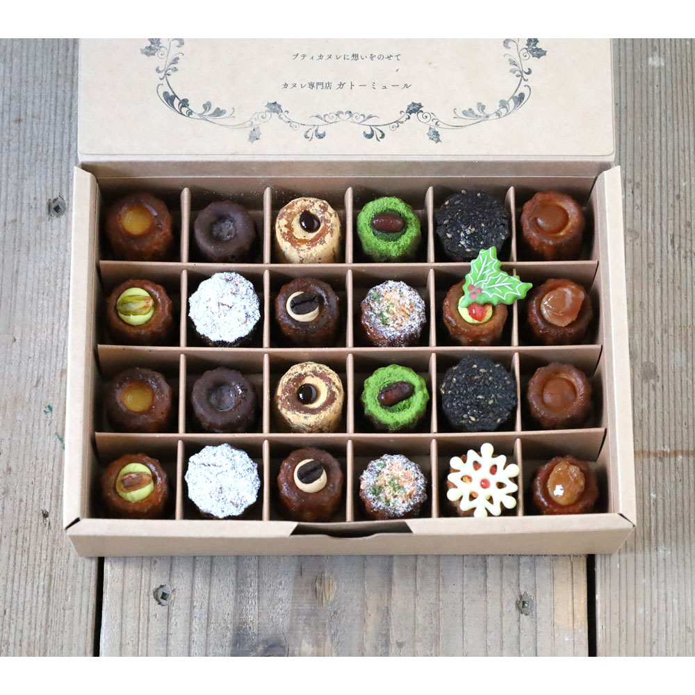 ミニカヌレ24個(バニーユ、ショコラ、西尾の抹茶大納言、黒蜜きな粉、黒ごま、黒糖とくるみ、キャラメル・サ・レ、ピスタチオ、バナーヌ、カフェ、モンブラン、ピスタチオフレーズ×各2個)