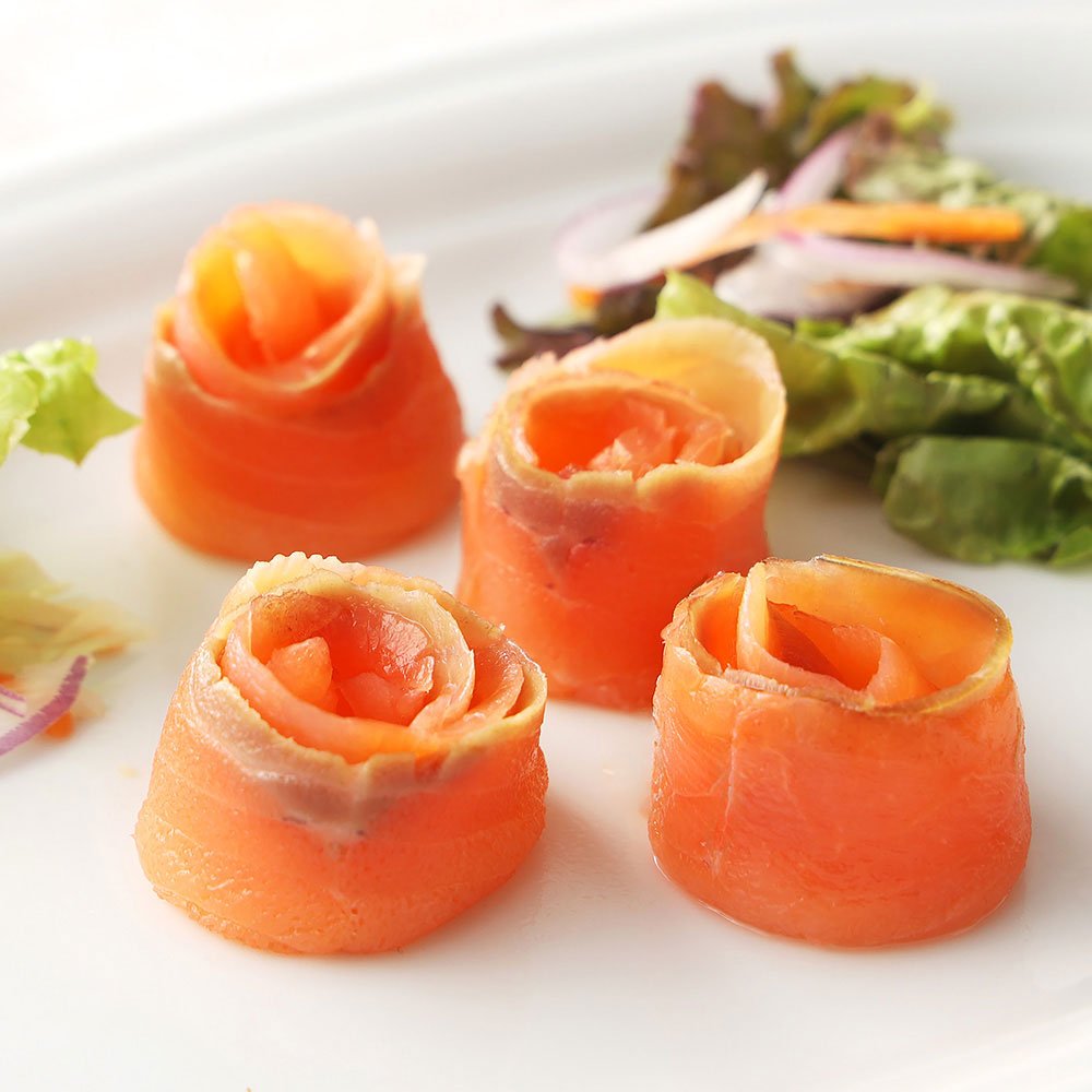 キングサーモン・フィヨルドサーモンは、チルド空輸した原料にこだわっり透明感のある味わいと上質な食感を追及。サーモンマイスターが厳選した原料をじっくりスモークしました。紅鮭は、アラスカのカッパーリバー産を使用。4つの氷河が流れ込む冷たい急流を遡るために、栄養をたっぷり蓄えた脂ののりの良いサーモンです。