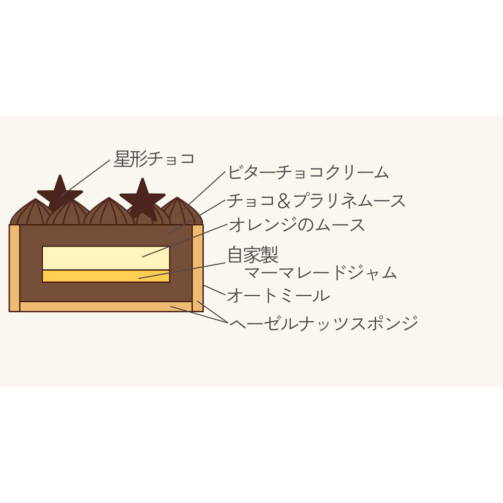 【冷凍便でお届けします。解凍まで時間がかかりますのでご注意ください。】<解凍時間の目安:冷蔵(10℃以下)で約8時間>フランス本店でも人気のヘーゼルナッツのプラリネのムースとオレンジのムースをあわせたケーキに、チョコレートを加えてアレンジしたクリスマス限定ケーキ。チョコレートとヘーゼルナッツプラリネのムースで全体を包み、中にバニラムースと自家製のオレンジマーマレードジャムを重ねております。マーマレードは果肉と皮の食感を残して炊き上げており、しっかりした酸味がチョコレートムースと好相性。外側のチョコレートムースは特に濃厚で、プラリネの香ばしさもあり、バニラムースのやさしい甘さが全体のバランスを整えています。外側のビスキュイの周りにはオートミールをつけて、南仏の豊かな自然の雰囲気をあしらっています。※ヴェルティゴ・・・フランス語で「目まい」。目まいのするようなおいしさです。