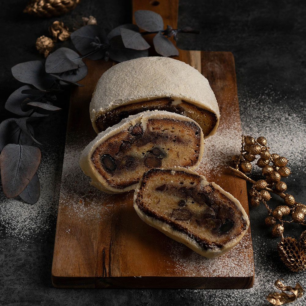 発酵バターの風味豊かな生地に、北海道産小豆入りのアーモンドクリームと、糀甘酒・本みりん・洋酒に漬けた伊予柑ピールや甘納豆(大納言・金時豆・栗)をたっぷり包みました。仕上げに和三盆糖をまとわせ、和素材のうまみと甘みが広がる、和のシュトーレンです。
