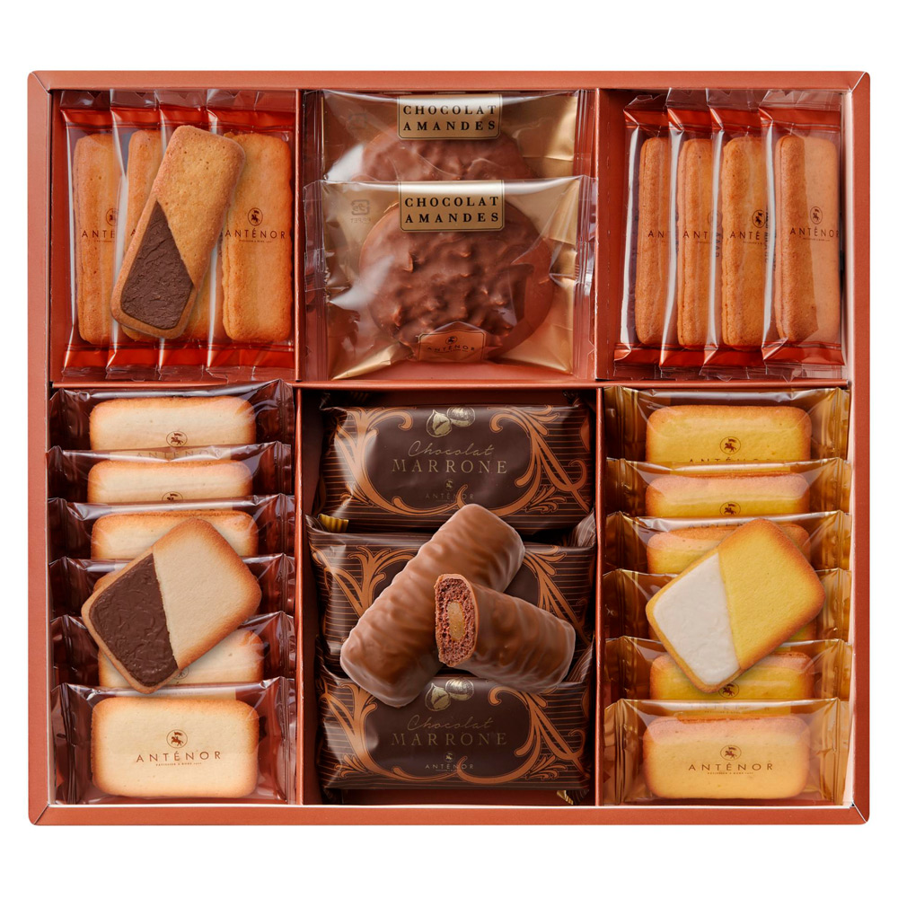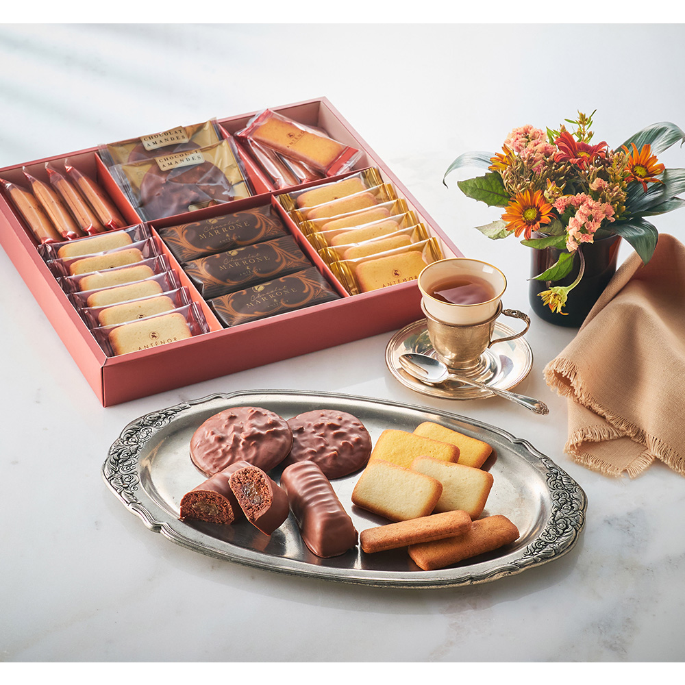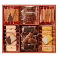 イタリア産栗のマロングラッセ入りのケーキをチョコレートで包んだ「ショコラ・マローネ」に、チョコレートをかけた香ばしいアーモンドクッキー「ショコラ・アマンド」、バターの香り豊かなラングドシャ、クッキーなど5種類の詰め合わせ。