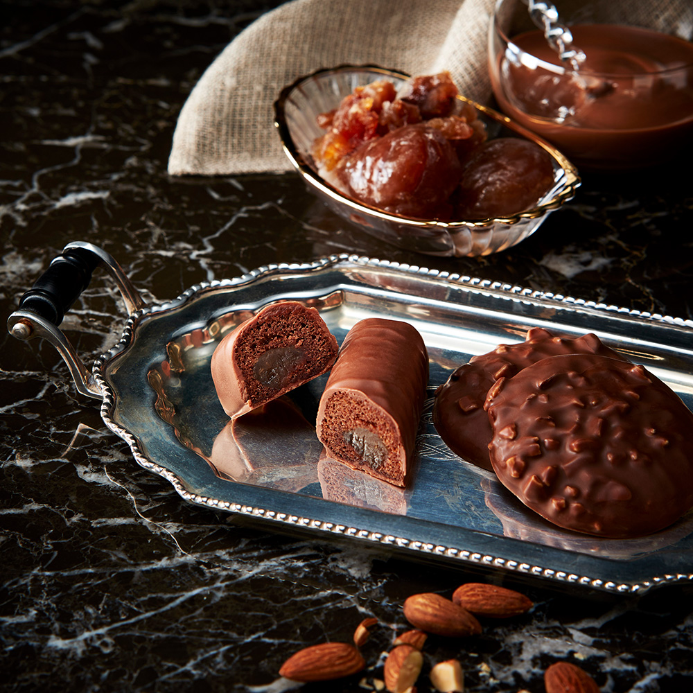 イタリア産栗のマロングラッセ入りのケーキをチョコレートで包んだ「ショコラ・マローネ」に、チョコレートをかけた香ばしいアーモンドクッキー「ショコラ・アマンド」、バターの香り豊かなラングドシャ、クッキーなど5種類の詰め合わせ。