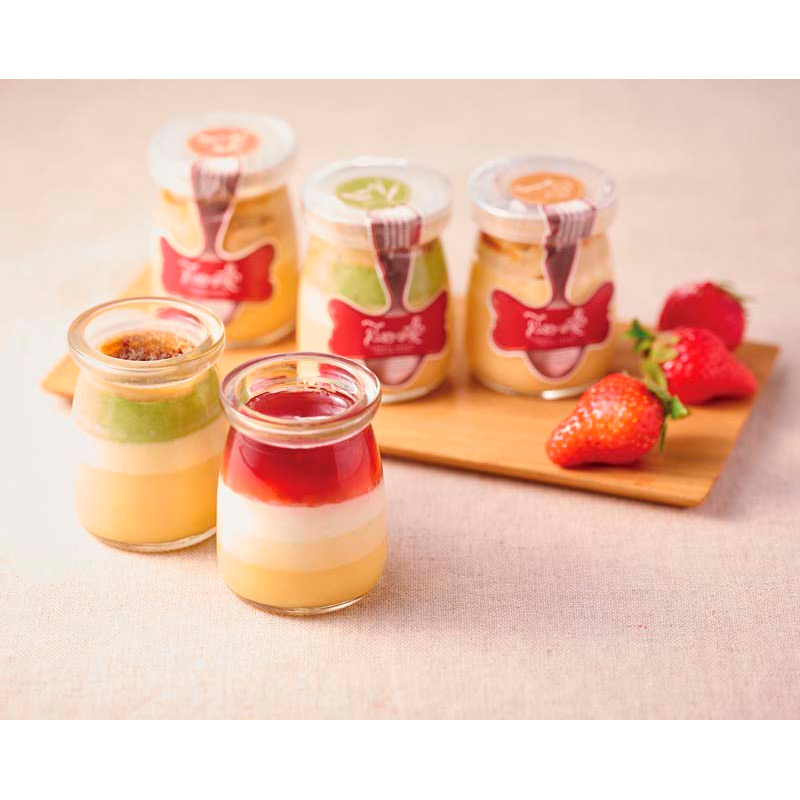 あまおういちごのチーズプリン90ml×3、キャラメルブリュレ(キャラメル・紅茶・抹茶)各90ml