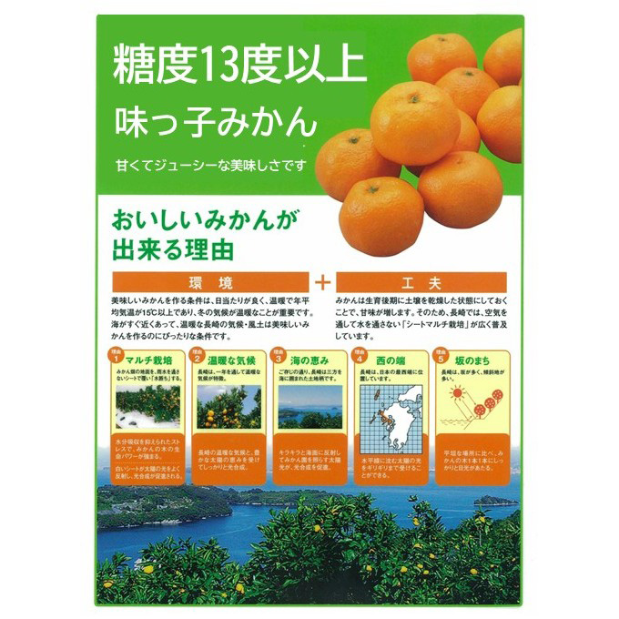 温暖な気候と豊かな自然環境に恵まれた西海みかん。海に面した急傾斜地の畑は水はけがよく、太陽の光がさんさんと降り注ぎます。西海みかんの栽培方法は100%有機肥料を使用し、地面全面にマルチシートを張るのが特徴。雨水の侵入を防いで水分をコントロールすることにより甘みを凝縮させます。またマルチシートで日光を反射させ、葉にたっぷりの光を当てることによりコクや旨みの強いみかんが育ちます。選果後は厳しい品質検査を受け、糖度13度以上のみかんだけが「味っ子」として販売されます。