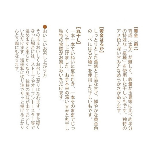 「黄金泉」は甘みが強く、舌ざわりなめらかで独特の味わいのある希少品種「泉」を使用しております。「丸干いも」は1本1本ていねいに皮をむきじっくりと干し上げました。「黄金はるか」は人気の品種「べにはるか」を使い、上品でまろやかな甘みと柔らかさが特徴です。自社農場にて手塩にかけて育てあげたさつまいもを、手作りにこだわり、独自の深蒸し製法で蒸し上げ、丁寧に干し上げました。大地と太陽の恵みいっぱいのこだわりの干しいもです。ぜひ一度、ご賞味ください。