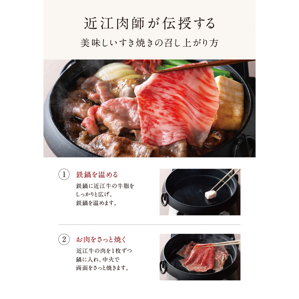 近江牛の赤身肉をご用意。ウデ、マル、カケ、ラム、ヒラなど、近江肉師がその日のおススメで選んだ4品を詰合せいたします。近江牛に合わせた手作りすき焼きのたれでご賞味ください。