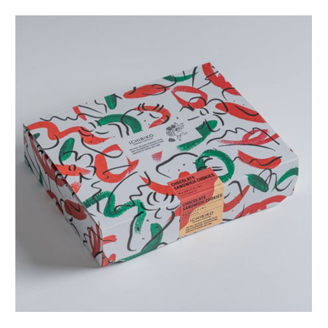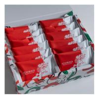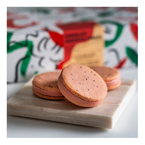 いちごのシードが入ったいちご味のクッキーでフランボワーズソースの入ったマスカルポーネチョコレートをサンドしました。あまずっぱい上品な味わいのいちご味のチョコレート菓子です。