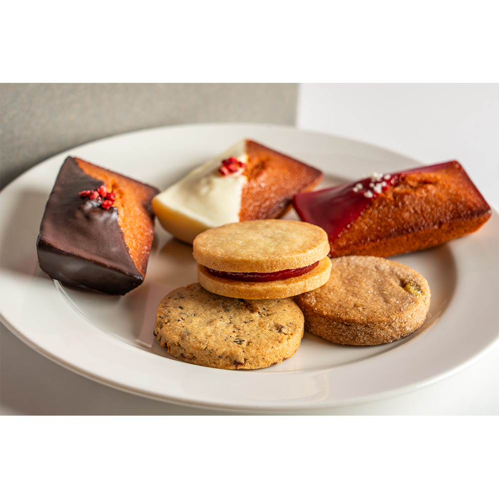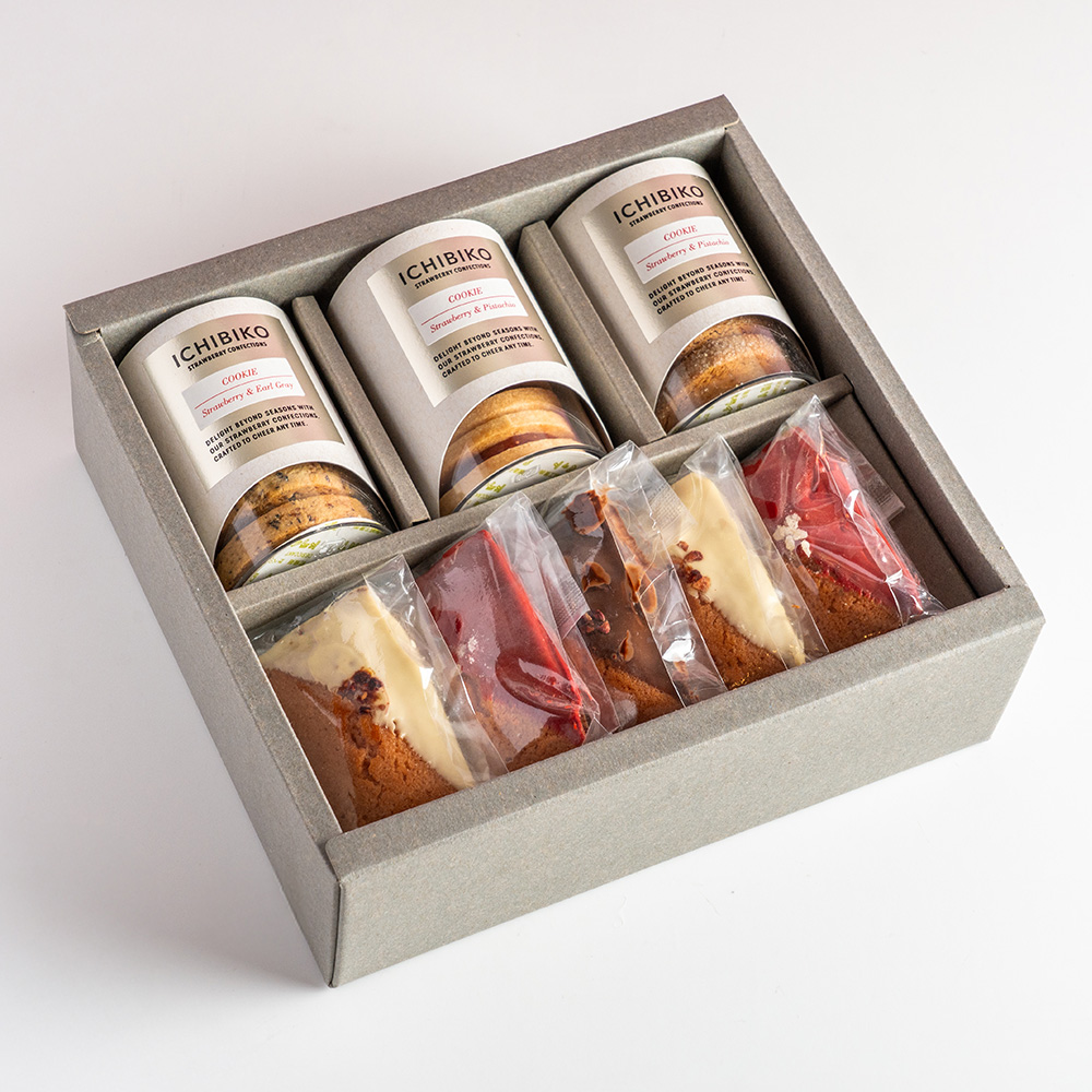発酵バターを使用し香ばしく焼き上げたクッキー生地に、ミガキイチゴと木苺を混ぜたジャムをサンドしたクッキー、セミドライ苺の生地にアールグレイの茶葉を練り込んだクッキー、苺パウダーを練り込んだ生地にピスタチオの食感がアクセントになったディアマンと生地に手作りのいちごジャムを練り込んだいちごジャムフィナンシェに3種のチョコレートをかけたフィナンシェの詰め合わせ。